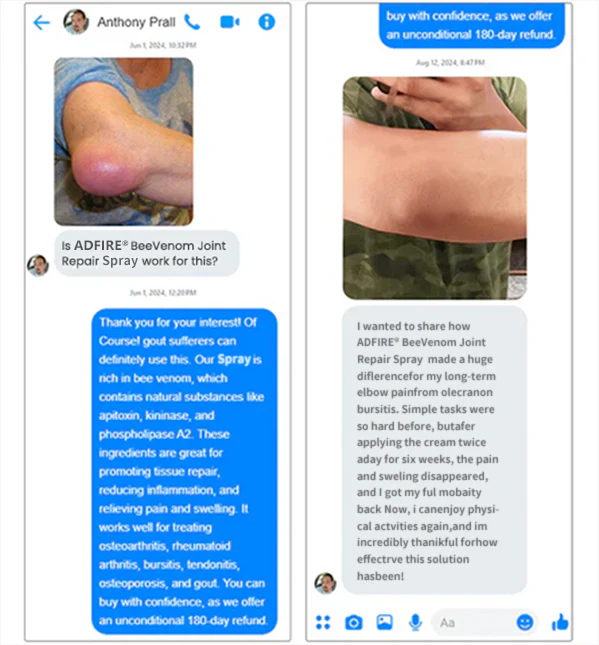 “For over five years, agonizing gout pain in my feet made life miserable. I spent thousands on treatments that didn’t work. Desperate for a solution, I tried Adfire® Bee Venom Bone & Joint Revive Spray. Within three weeks, I noticed relief, and after seven weeks, my pain was completely gone! This spray restored my freedom and quality of life.”